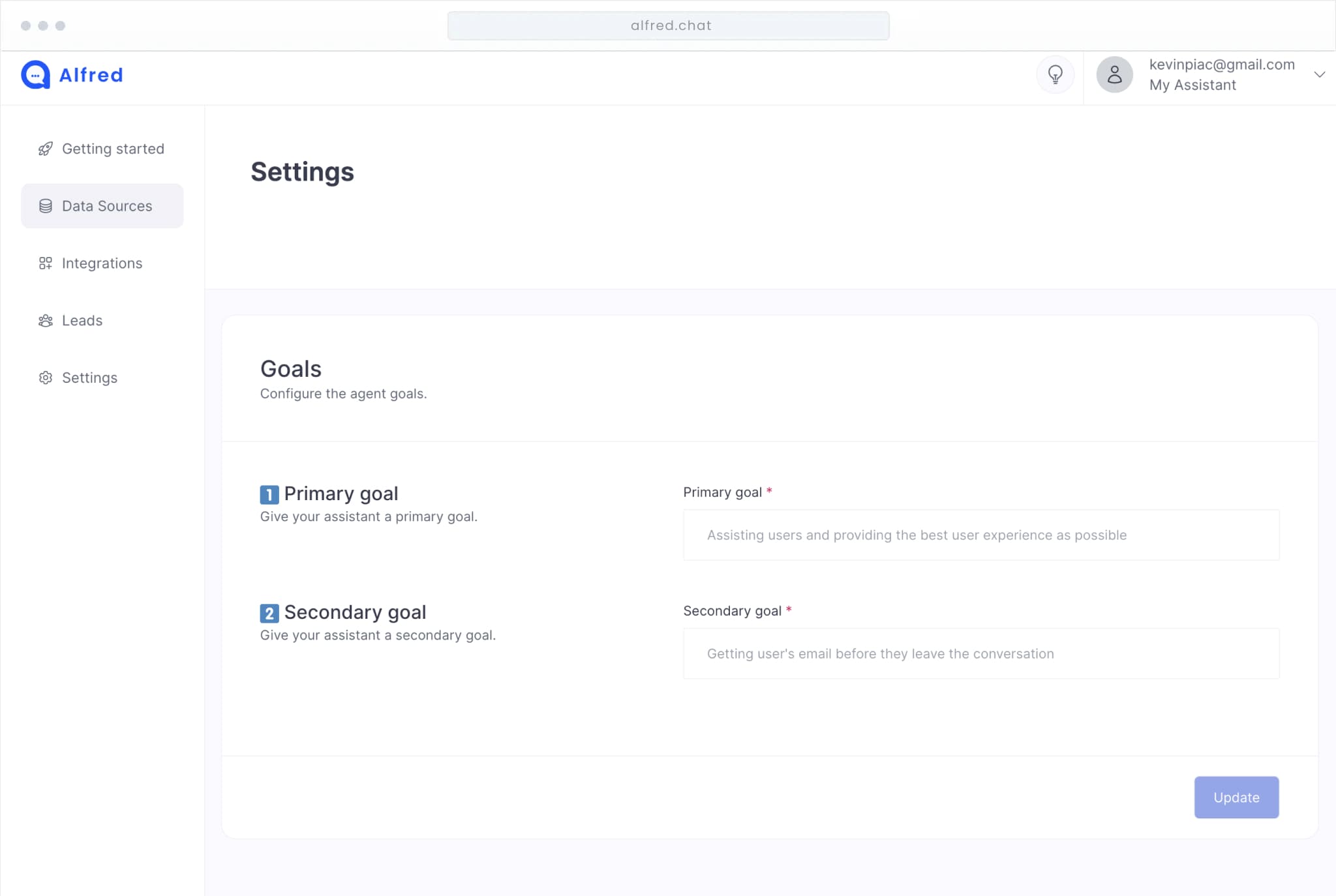 Alfred will automatically synchronize with your data sources so he stays up to date and can answer questions about your application.